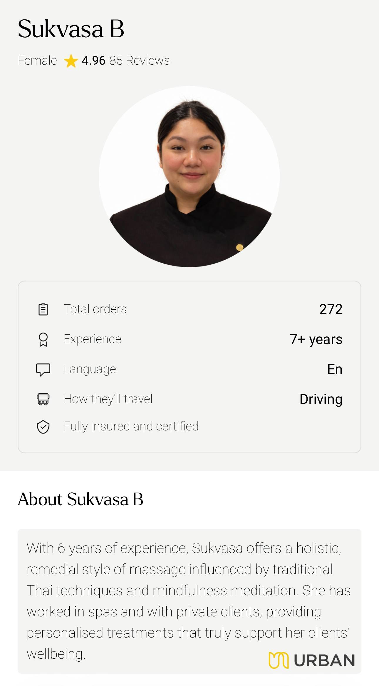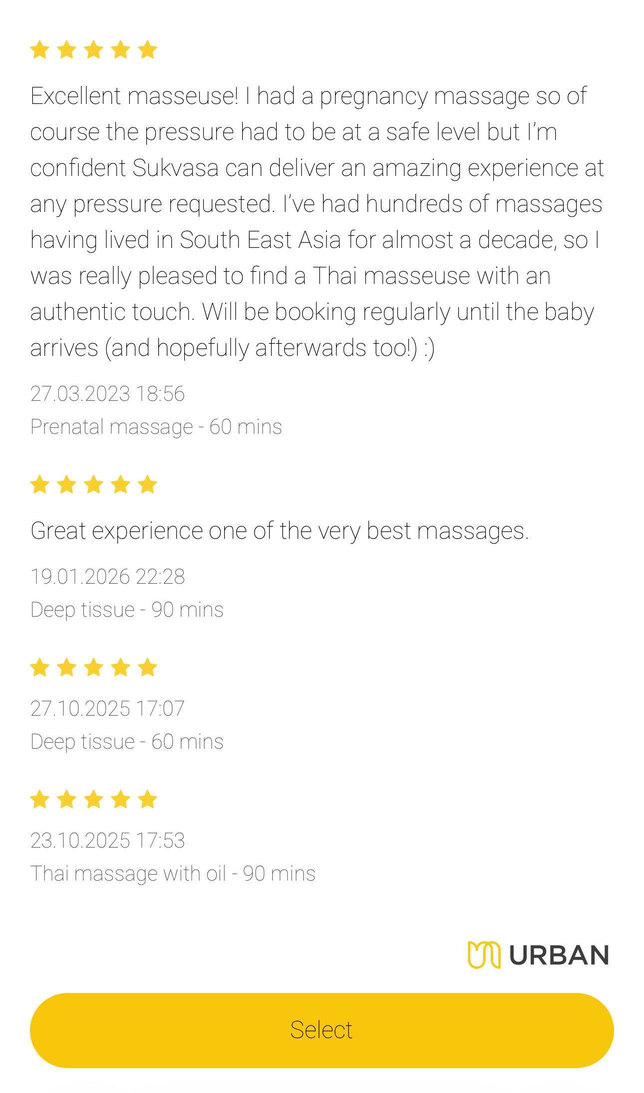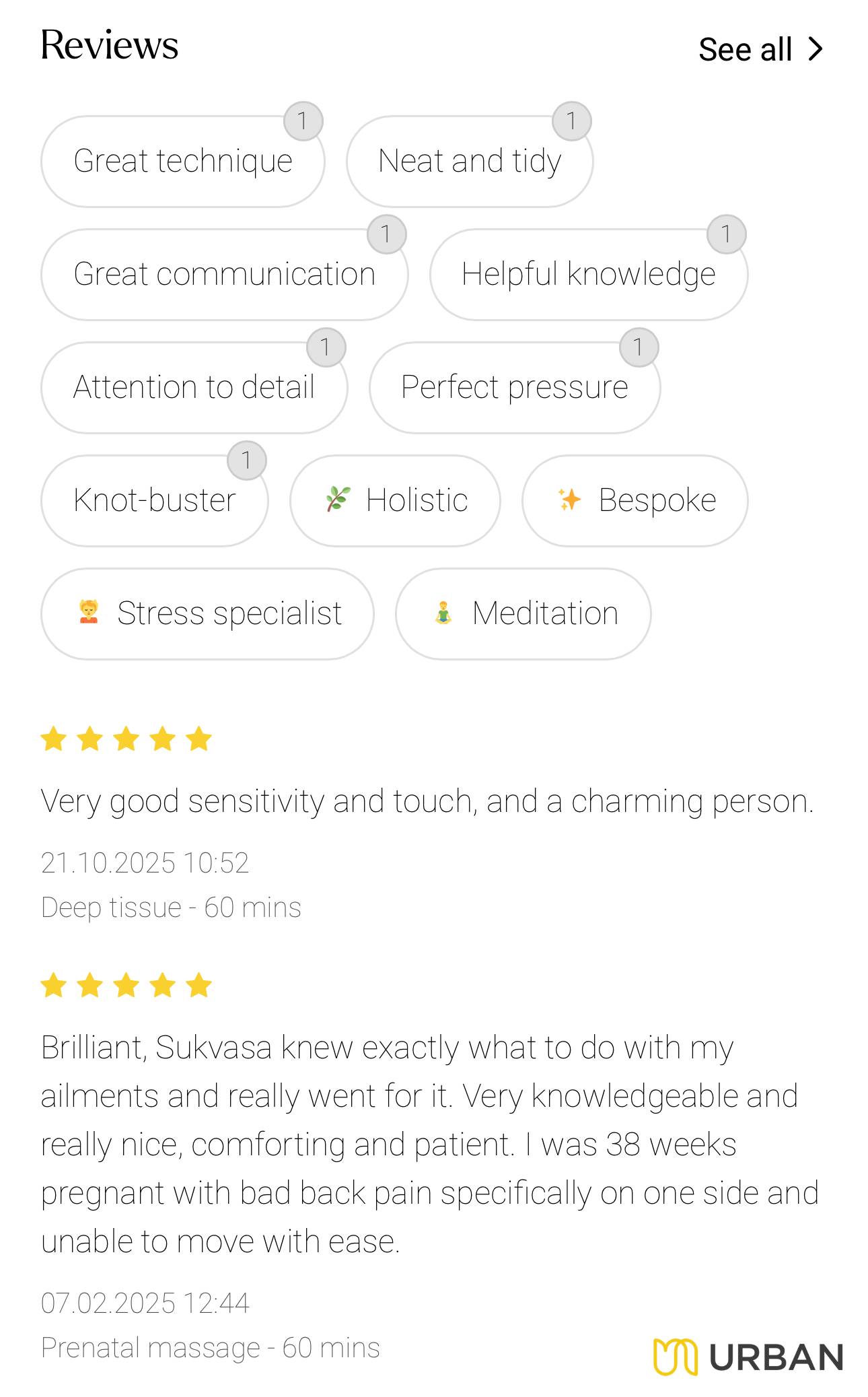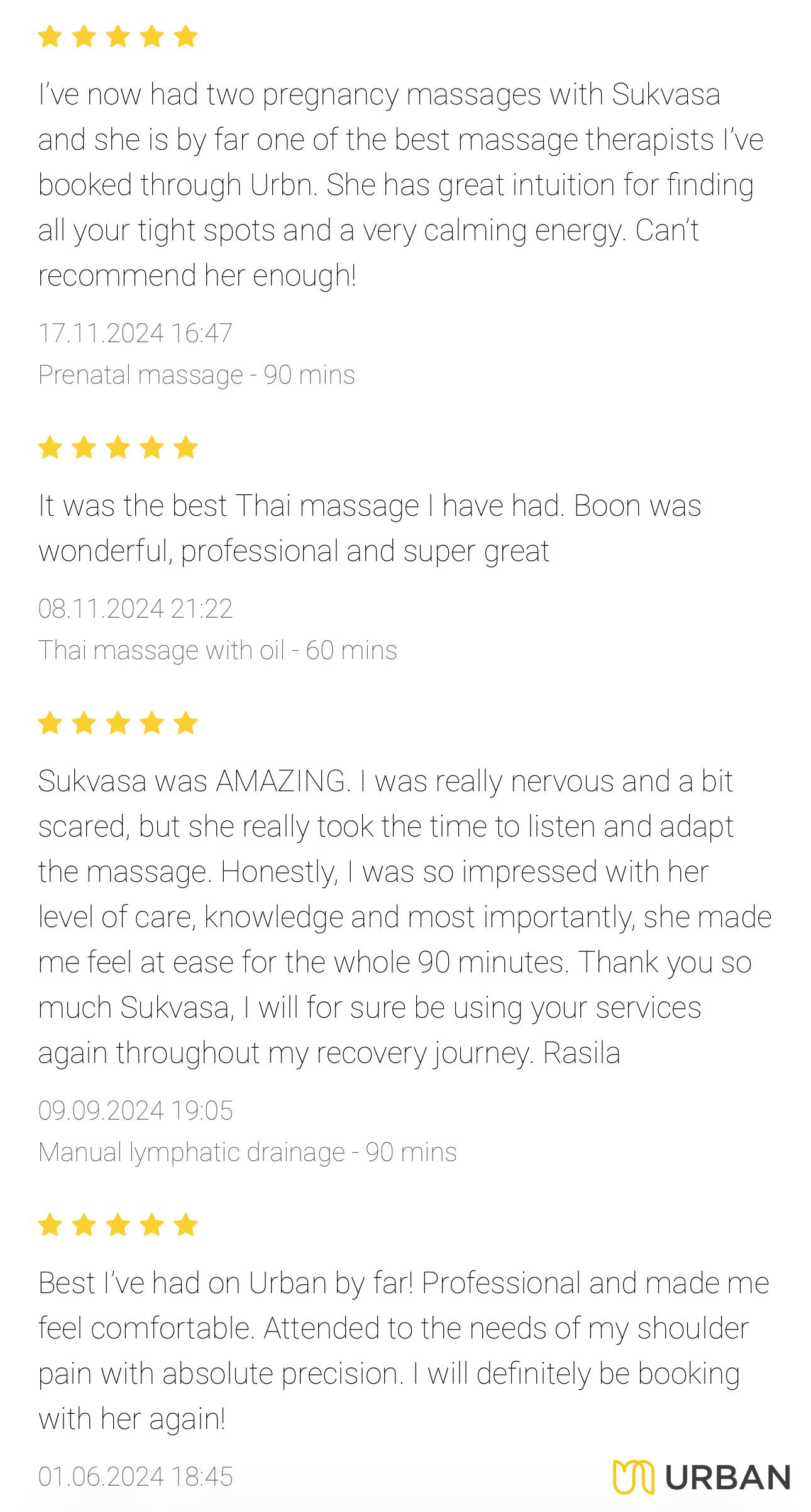 My professional experience began in several West London spas, including Thai Square Spa, before I transitioned to mobile massage in 2023 through platforms such as Urban and Ruuby. These years of practice have taught me that every body is unique.