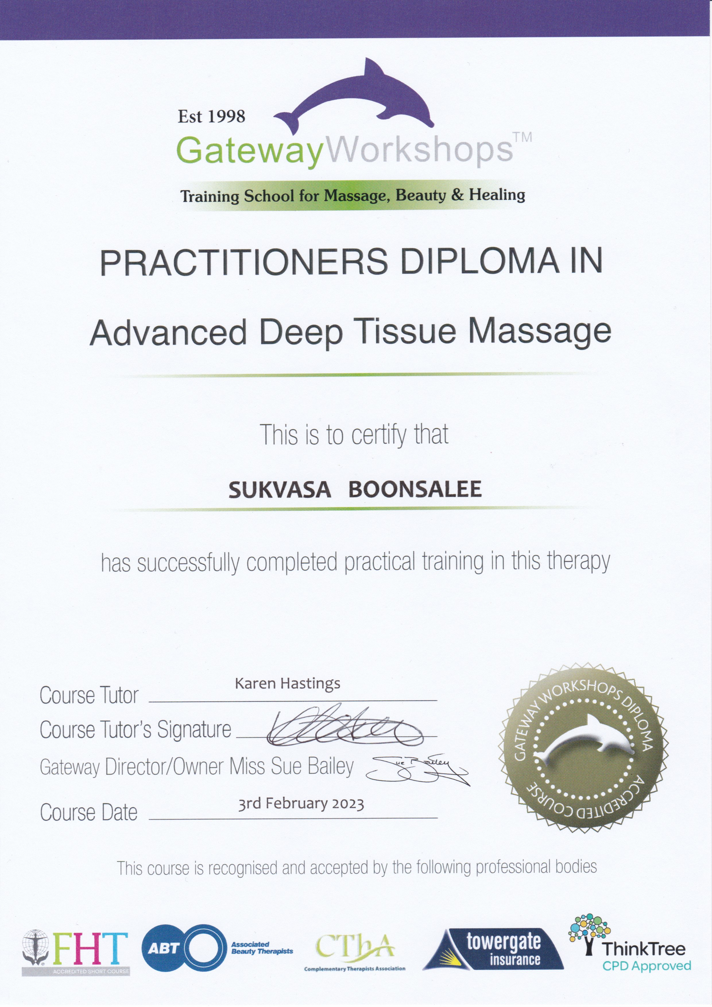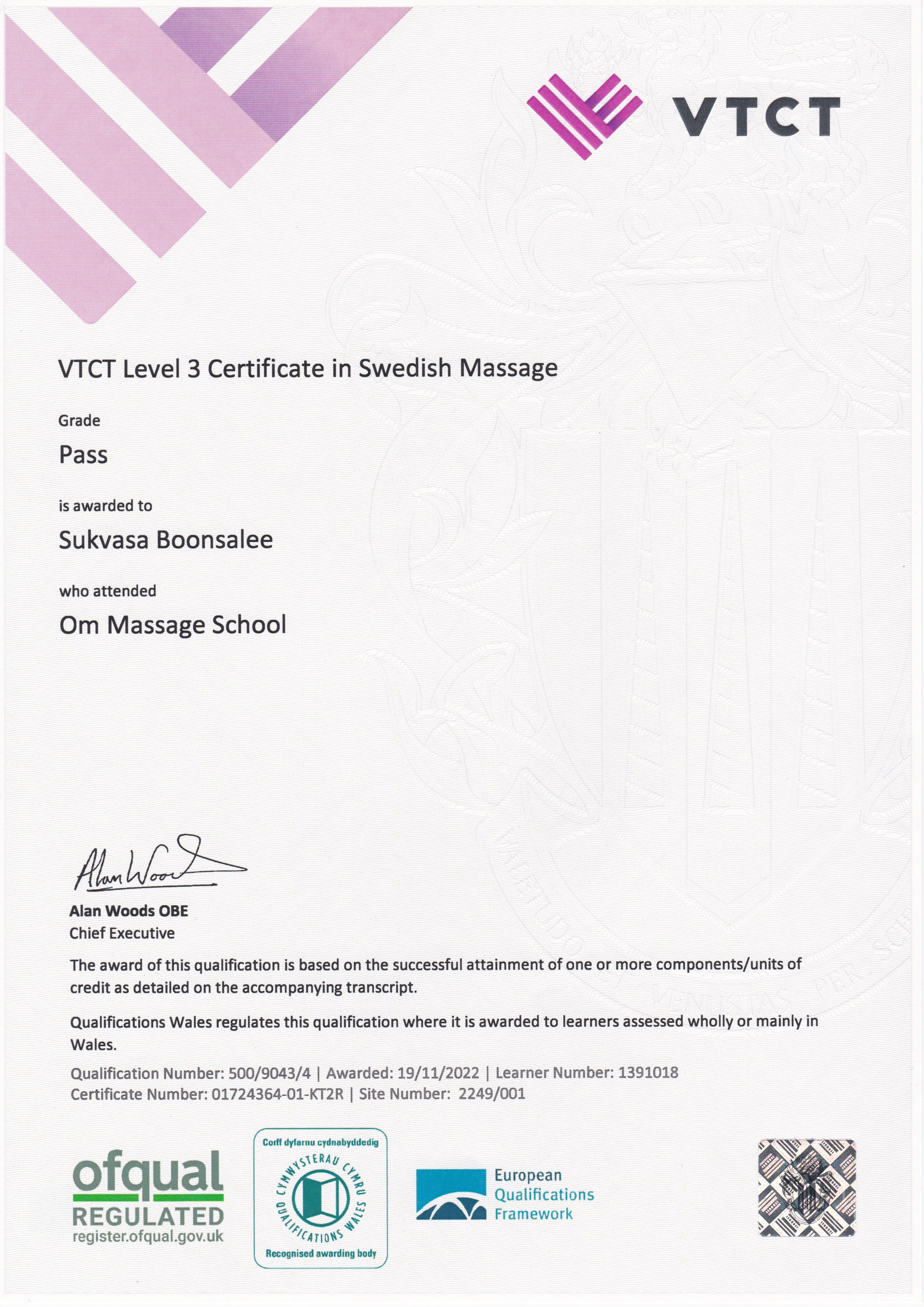 A gold-standard UK clinical qualification (VTCT) ensuring expert knowledge in anatomy and safe, professional bodywork. My training guarantees a sophisticated approach to deep relaxation and holistic recovery.